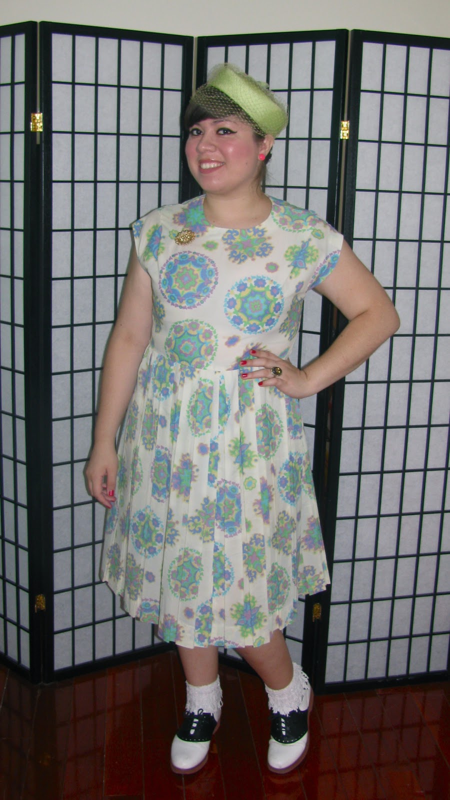 Dress: Vintage, Shoes: Bass, Shoes: Macy's, Broach and Earrings: Monk, Pillbox Hat: Antiques Garage